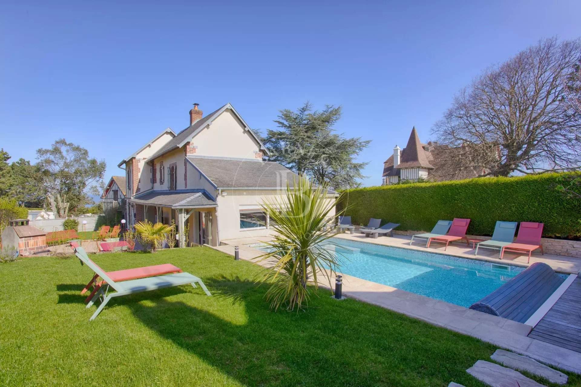 A Bénerville, proche de la plage et à 3 mn de Deauville, villa offrant une belle pièce de vie avec salon / salle à manger, cuisine, une chambre double avec salle de douche, une salle de bain, toilettes et buanderie. A l'étage, une chambre double vue mer avec mezzanine (espace repos), une chambre deux lits simples avec terrasse. Un espace enfants/ados aménagé dans les combles avec salon TV. En annexe ouverte sur le jardin une chambre double avec salle de douche. A votre disposition : piscine (4 m x 9m) avec douche extérieure, sauna, salle de sport, ping-pong, terrasse avec barbecue, borne pour voiture électrique. Emma SALESSE - Agent commercial - EI - RSAC